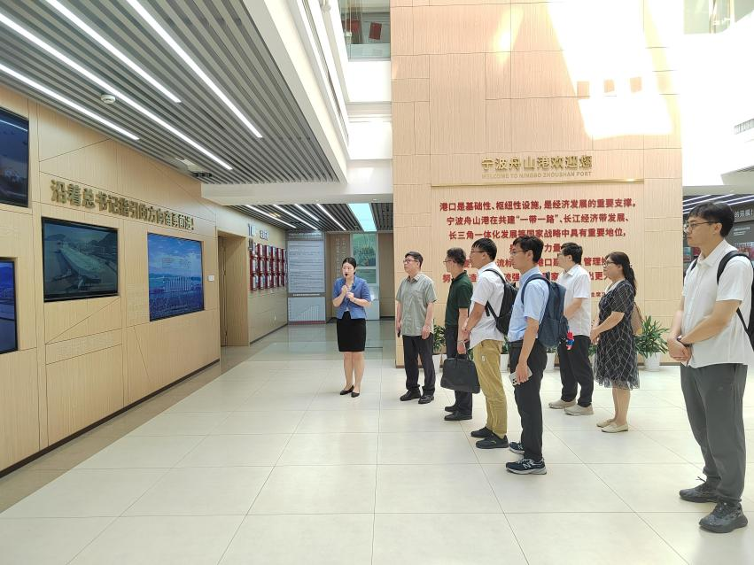 9月12日上午,调研组前往宁波舟山港穿山港区调研考察。宁波舟山港是我国重要战略枢纽港口,习近平同志在浙江工作期间亲自谋划推动宁波港、舟山港一体化发展,目前港口年货物吞吐量已连续16年蝉联世界第一,集装箱吞吐量稳居世界第三。调研组深入学习了解港口发展历程,宁波市商务局相关负责人就宁波舟山港对日美欧货物进出口情况、宁波地方企业对外交流合作情况做了详细深入的介绍。